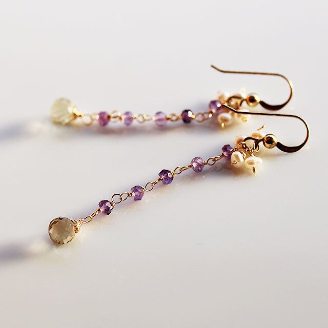 K14gf レモンクォーツ & アメジスト & 淡水パールの天然石ピアス